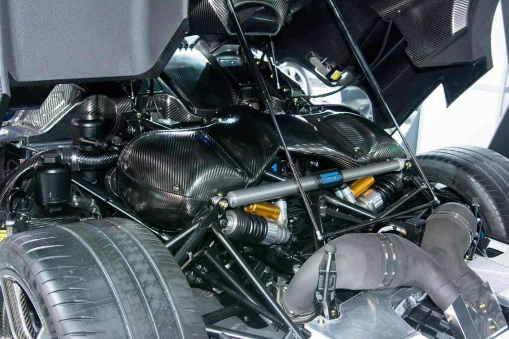 This version, destined for US roads, features an “Arctic White” paint job, with a generous amount of carbon fiber, and blue accents on the front aero pieces, side skirts, rear wing, diffuser, brake calipers and badging. The same blue is brought into the car’s Alcantara interior.
