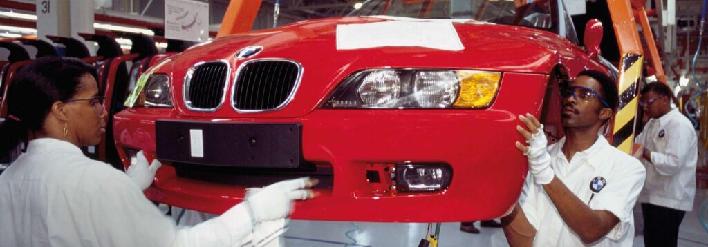 BMW besluttede at opføre en bilproduktionsfabrik i USA i 1989. Dette skridt understregede virksomhedens position som en global aktør. Fabrikken i Spartanburg, South Carolina, specielt designet til produktion af BMW Z3 Roadster, åbnede i 1994. Z3’eren eksporteres fra Spartanburg til hele verden. Fabrikken udvidede sine produktionsfaciliteter i slutningen af 1990’erne, og i dag produceres BMW X3, X4, X5 og X6 modellerne alle i Spartanburg.